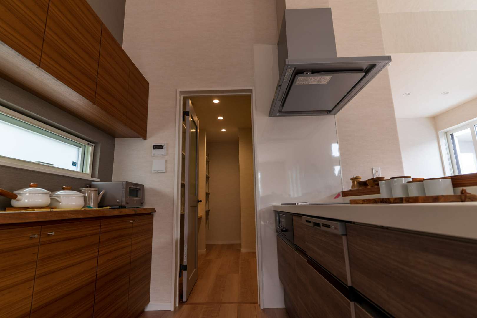 まず1つは、キッチンの壁の一部をパントリーとする壁面収納型。