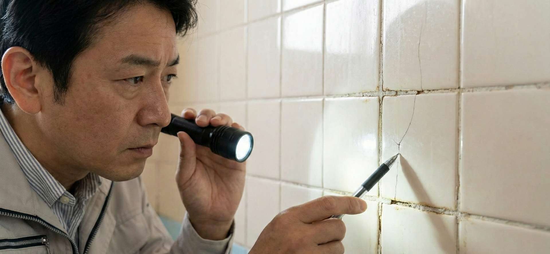 浴室は、毎日のお湯による温度変化で膨張と収縮を繰り返しています。また、マンション特有の微細な振動や地震の影響も受け続けます。 これらが積み重なると、タイル自体や、タイルとタイルの間の目地に、肉眼では見えにくいほどの「ヘアクラック(髪の毛ほどの細いひび割れ)」が発生します。